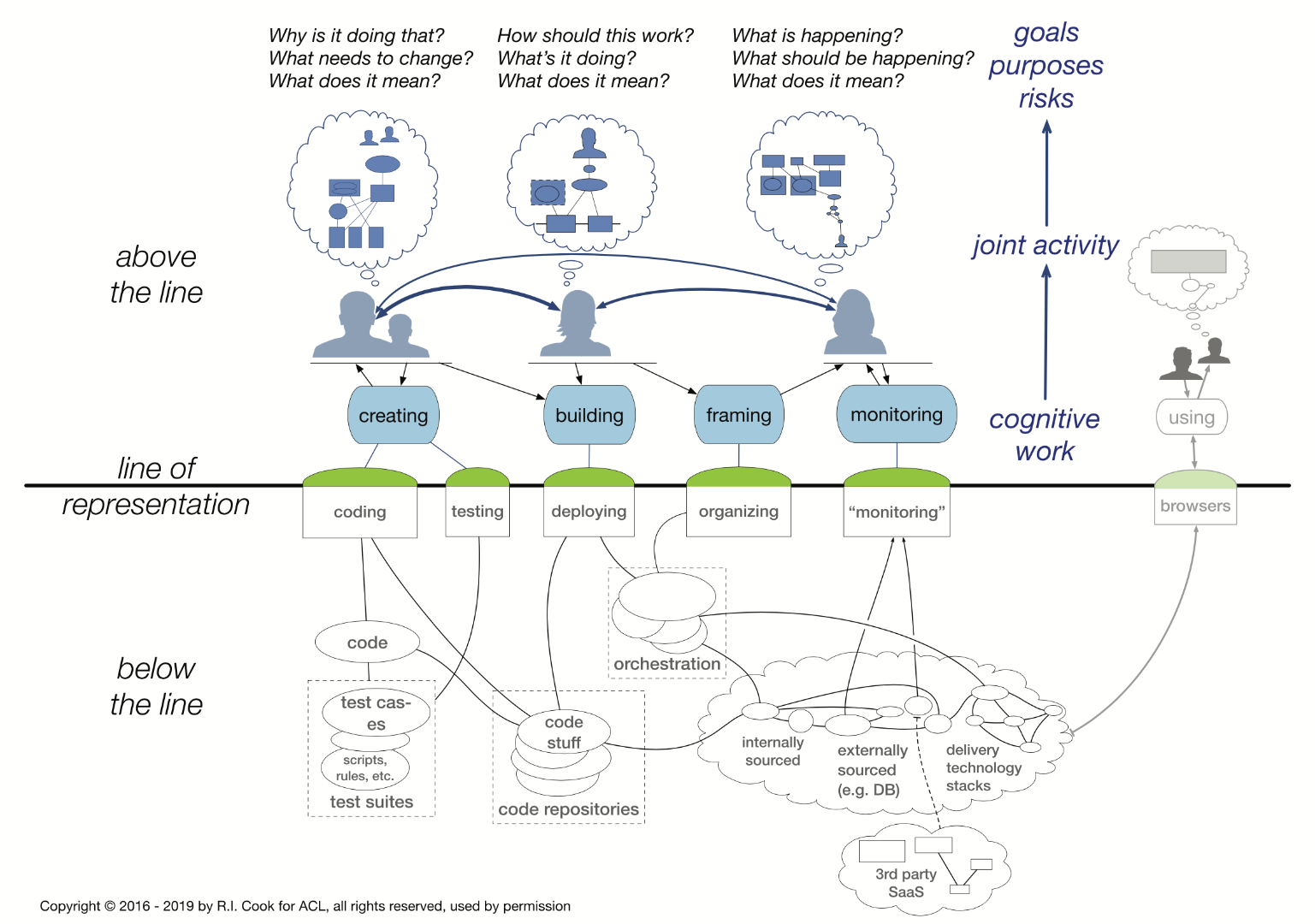 At IT Revolution conference in 2018, Richard Cook explained the above the line / below the line framework, clarifying complexity, mental models and emphasizing that continuous partial failure is the normal state of our software systems. The study of incidents is the revealing thing about how systems actually work. See Working in the Cyclone.